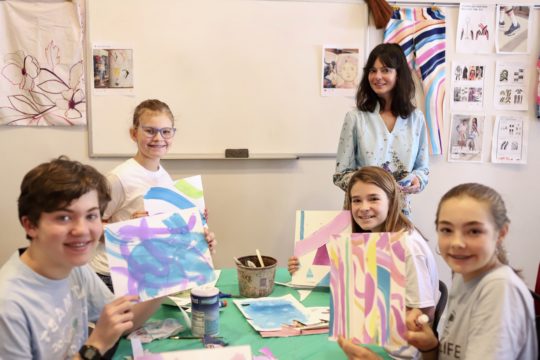 As a S.T.E.A.M accredited school, skills such as creativity, problem-solving, empathy, teamwork, and critical thinking are infused into every aspect of the classrooms at Five Oaks Academy. The Academy hosts special guest artists and innovators throughout the year as part of their rich creative curriculum. Recently, local artist Eva Magill-Oliver took students on an artistic journey of discovery. Known internationally for her design collaboration with Nike, Anthropologie and a French linen company, Eva gets her inspiration from the natural world. With her guidance, students gathered images of interesting colors, textures, and patterns to create personalized inspiration boards. She then demonstrated different techniques with liquid watercolors, allowing students to experiment with color and collage papers together in new and unexpected ways.